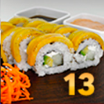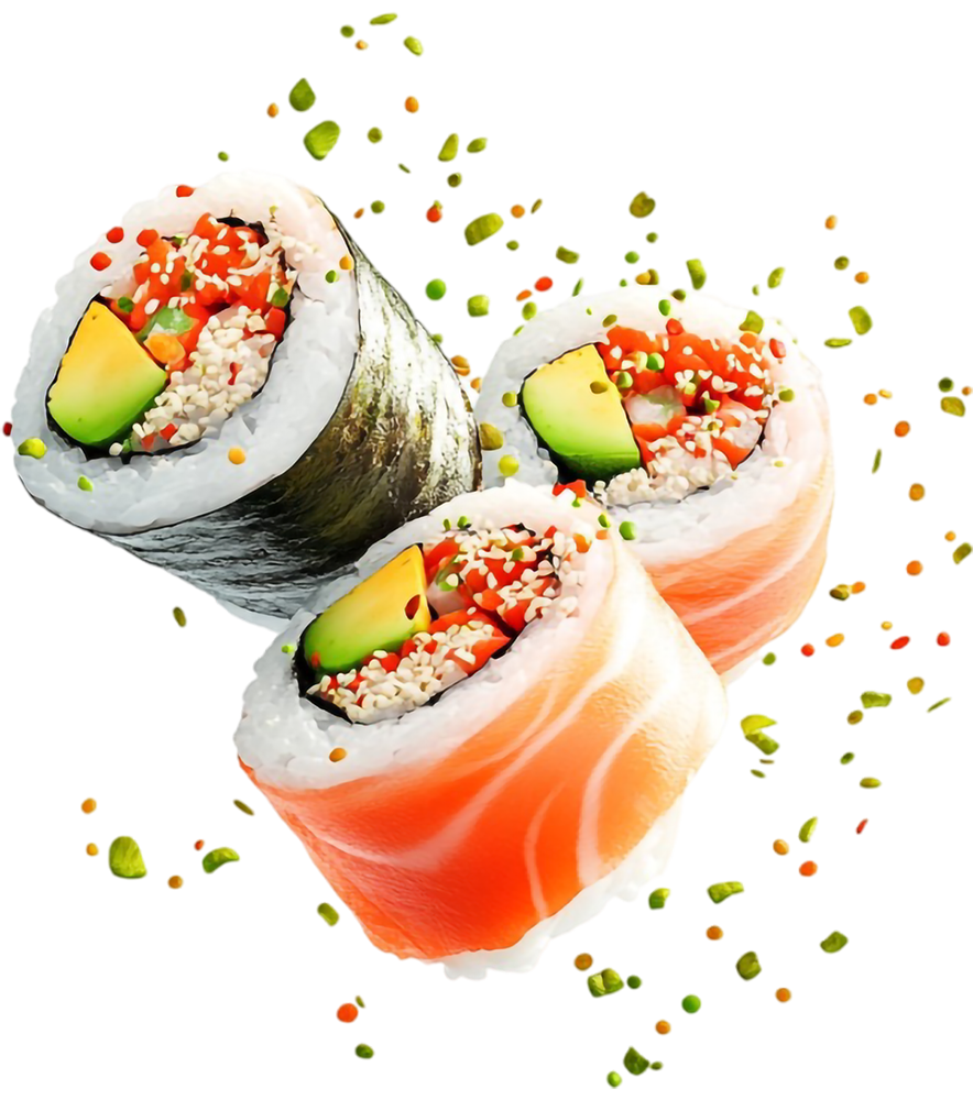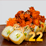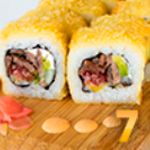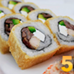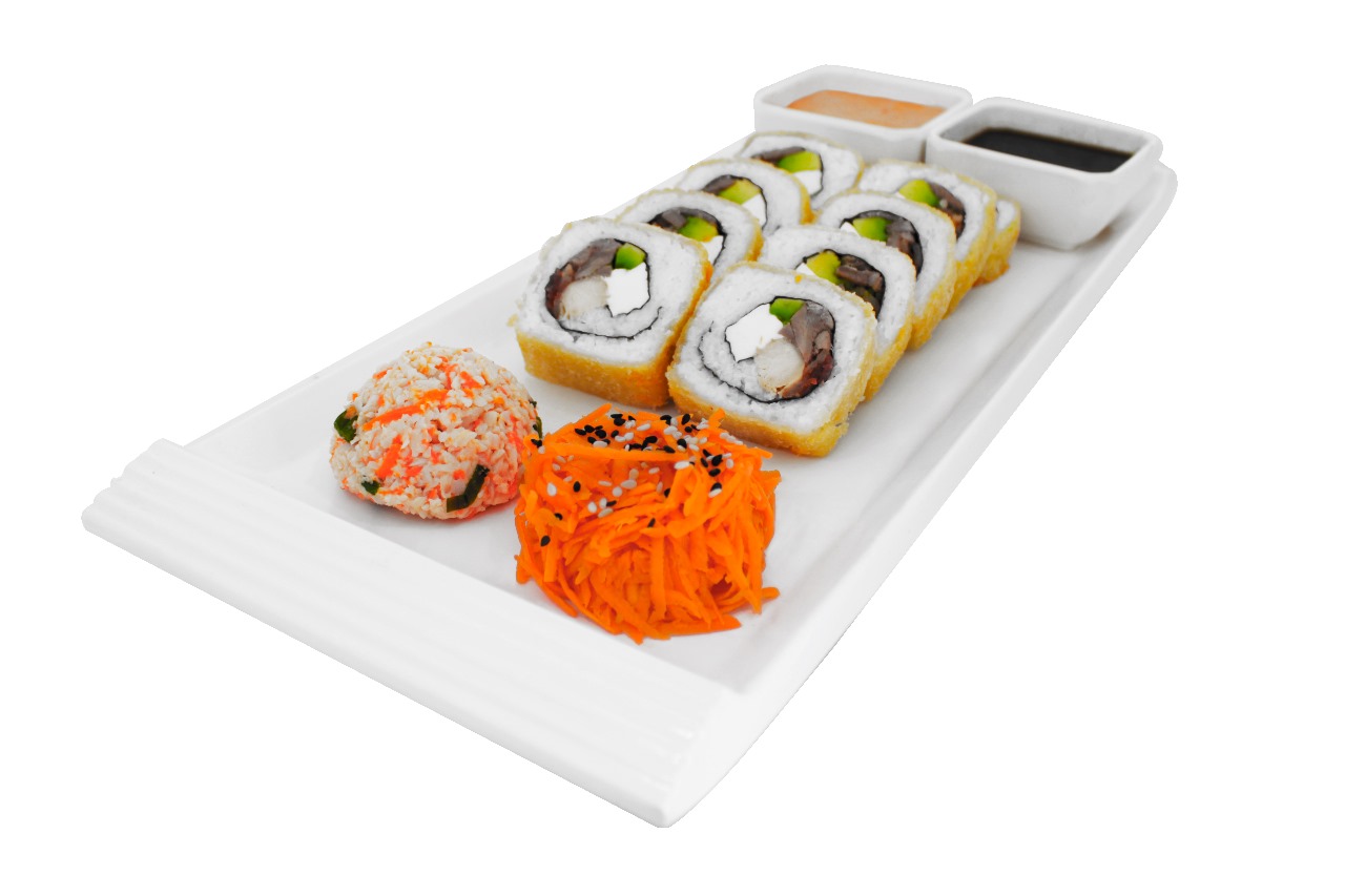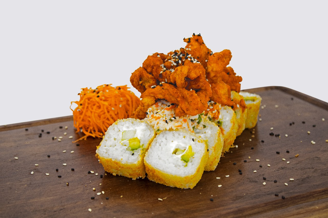 Sushi empanizado, por dentro lleva philadelphia, aguacate, pollo, res y tocino. Acompañado de zanahoria, tampico, salsa ponzu y aderezo chipotle.