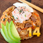 Arroz frito con zanahoria y cebolla cambray. Puede ser de pollo, res, camarón, veggie o mixto.