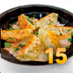 Camarón empanizado, aguacate, pepino y chiles toreados. Por fuera cebollín, bañado con queso manchego gratinado y aderezo chipotle.