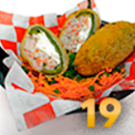 Poppers rellenos de queso philadelphia, pollo, res y tocino. Por fuera empanizado con tempura y panko. Acompañado de verduras y aderezo chipotle-teriyaki.