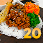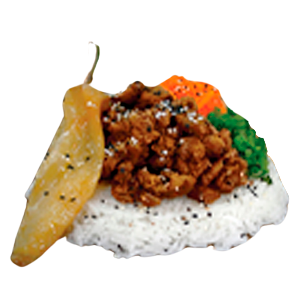 Puerco teriyaki sobre una cama de arroz blanco Gohan acompañado de un chile toreado con decorado de ajonjolí, chile quebrado y cebollín.