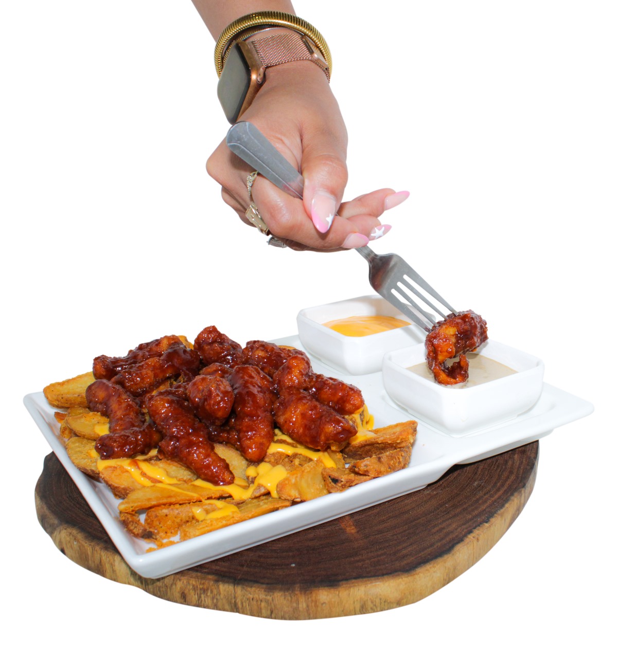 250 gramos de ricas papas sazonadas cubiertas de aderezo de queso, acompañadas de 150 gramos de pollo con cubierta crujiente, con la salsa de tu preferencia, Buffalo, Barbacue, Cookie o Mango Habanero.