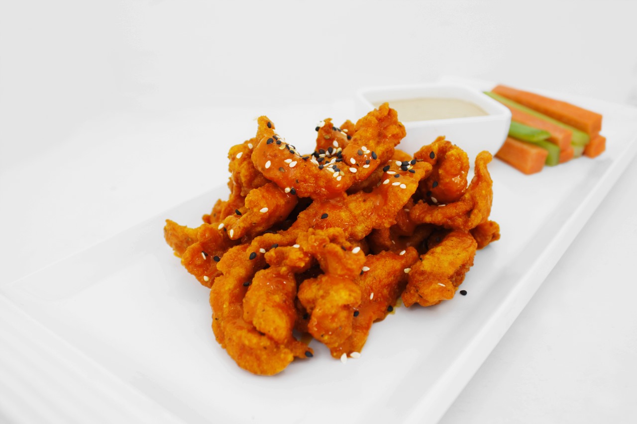 200 gr de pechuga de pollo empanizado, a elegir salsa búfalo o BBQ, acompañado de zanahoria, apio y aderezo ranch.